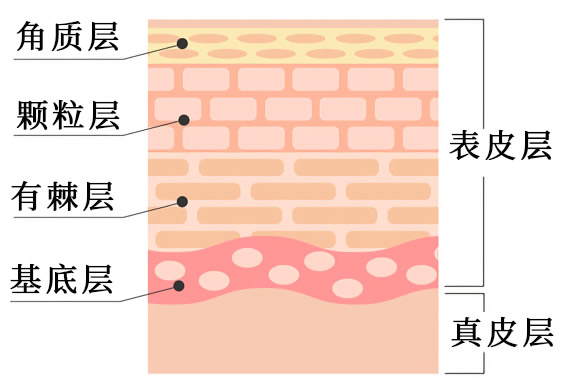 表皮为皮肤的最外层,它覆盖全身并有保护作用。表皮没有血管(因此划伤后不会出血),但有许多微小的神经末梢。表皮按细胞形态可分为5层,由外至内依次为:角质层、透明层、颗粒层、棘细胞层、基底层。